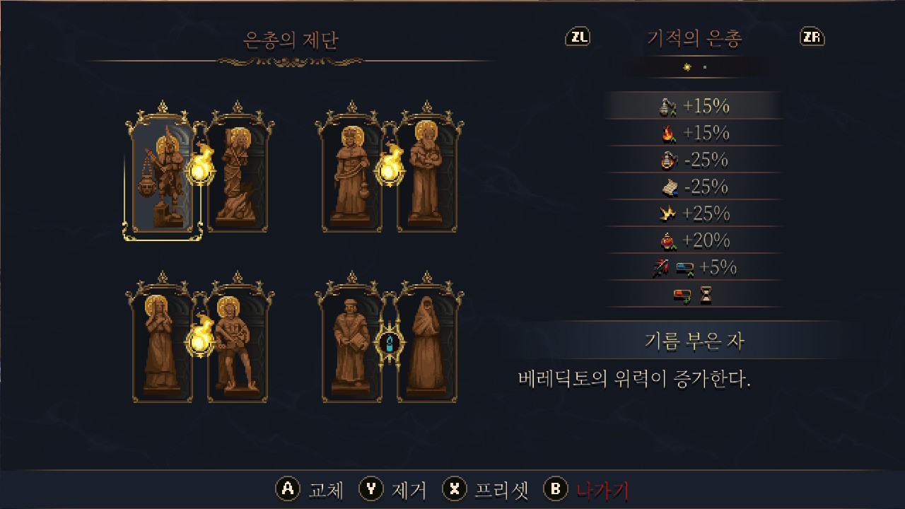 단순히 무기의 위력부터 시작해서 일부 무기의 특수능력을 강화한다던가, 담즙플라스크를 마실 시 열정게이지 혹은 무기 게이지가 찬다던가 죄책감이 쌓일수록 딜이 증가하는 등등 별 희안한 옵션들이 잔뜩 달려있으니 이것저것 본인이 쓰고싶은걸 사용해보는 편이 좋다.