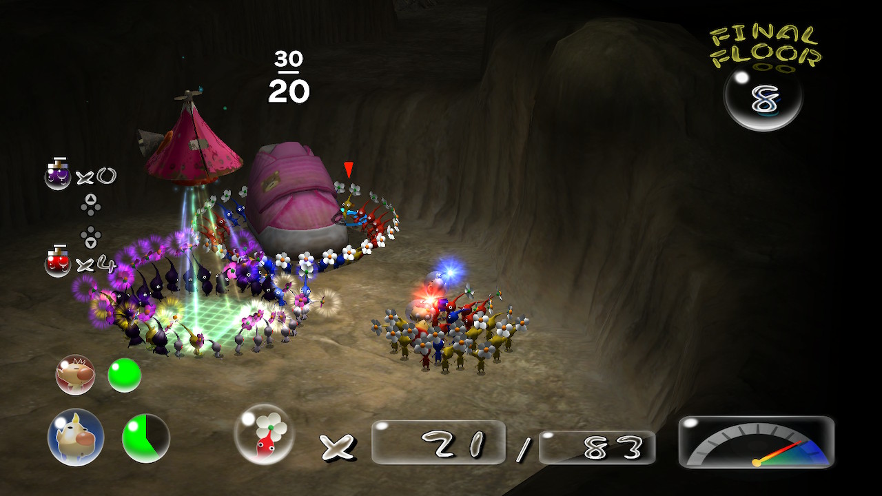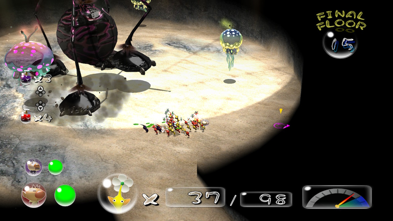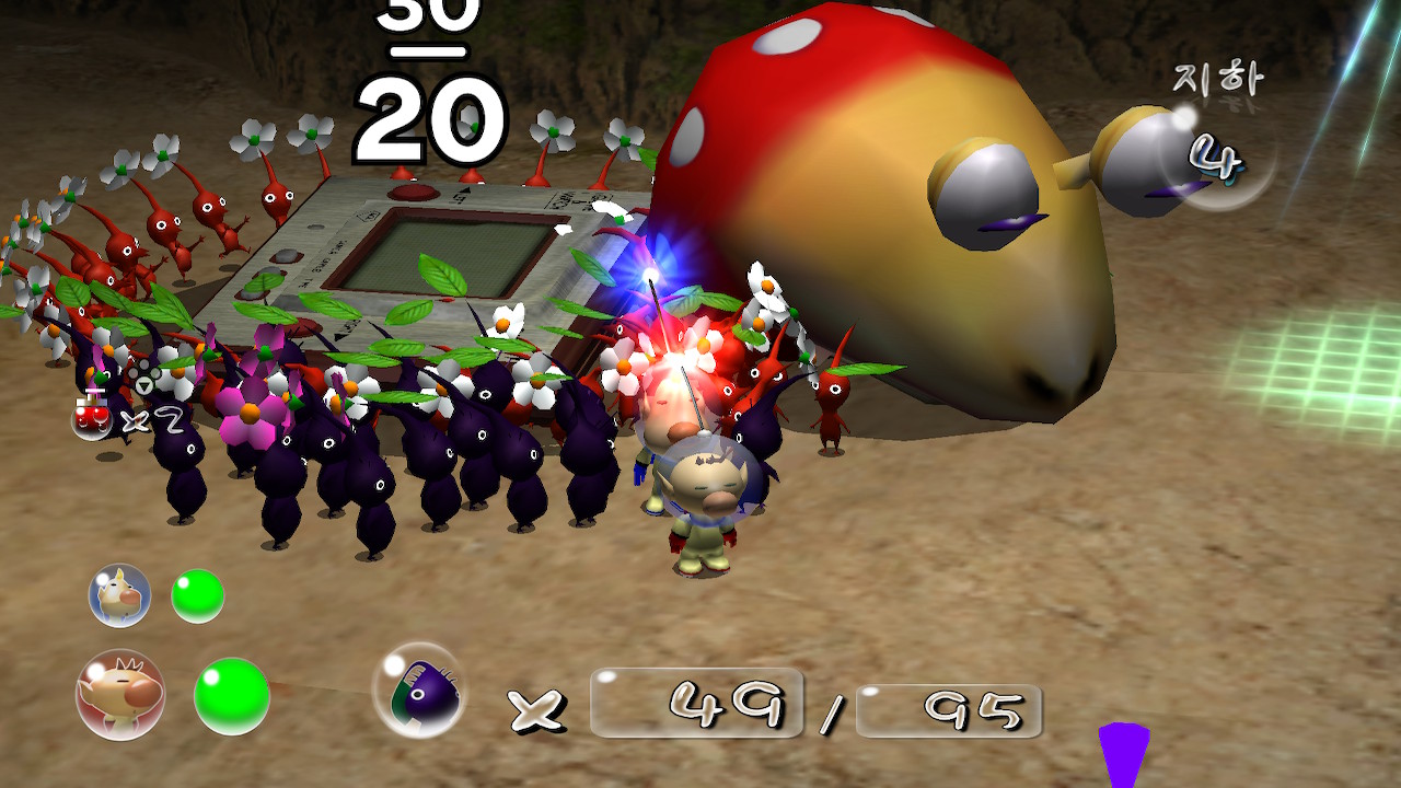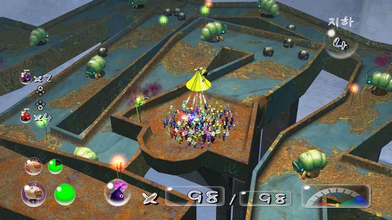 게다가 지하동굴의 경우 지상과 달리 데리고 입장한 한정된 피크민만으로 진행을 해야해서 지하에서 피크민 다 잃으면 다시 지상으로 돌아가 부족한 숫자를 채워 재도전을 해야한다.