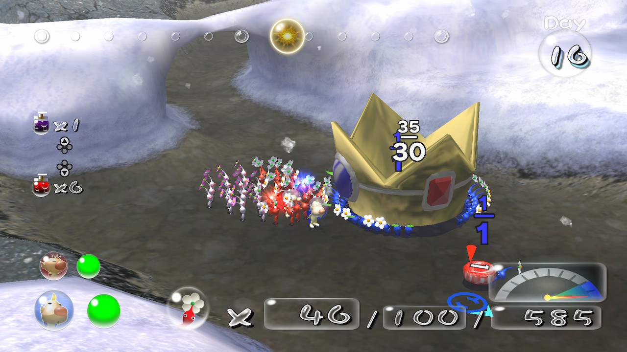 덕분에 게임강제종료 → 불러오기를 정말 시도때도없이 하게 만드는데, 정해진 하루동안 뭐부터 회수를 할것이며 그러기위해선 어떡게 길을 개척해놔야할지, 유저에게는 준비물인 필요한 피크민들을 얼만큼 생산해놔야할지 생각할일이 많다.