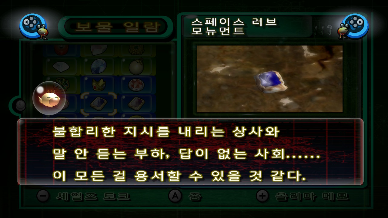 참고로 지하에서는 보물게이지 없어도 보물 전부 회수한걸 알 수 있는방법이 있는데 층마다 보물을 전부 회수했을경우 피크민들 데리고 이동 시 "냥↗냥↗냥↘냥↗냥→냥↘"이라는 노래를 불러댄다.
