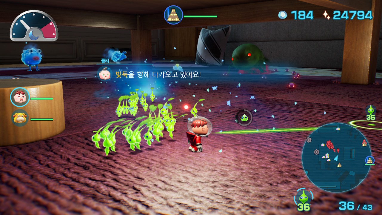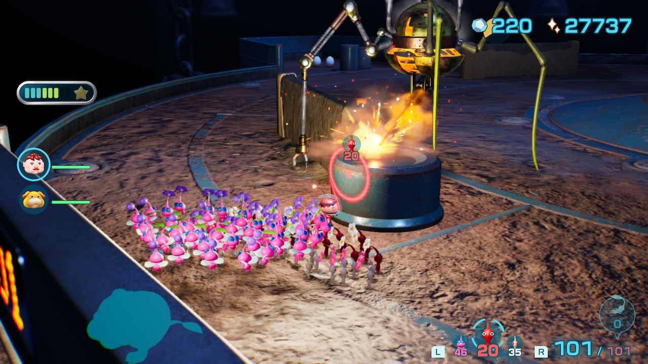 대시로 박치기하면 원주생물은 기절하면서 피크민들을 원주생물에 몽땅 갖다붙일 수 있다던가,