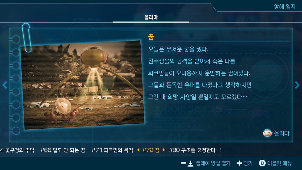 2편때도 지하 동굴 입장때 추천 피크민 항목이 활성화 됐던게 이번작에서 고스란히 적용이 됐는데, 지하 동굴 외에도 일반 필드에서도 해당 필드의 추천 피크민이 자동으로 뜨는거보면 게임이 매우 유저 친화적으로 바꼈다는게 새삼느껴지네.