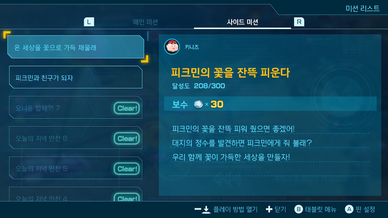 다행스러운건 피크민의 꽃 피우기/피크민 생산하기 이 두개의 퀘스는 완료마다 새로 또 생기기때문에 사실상 무한정으로 자재획득이 가능하다.