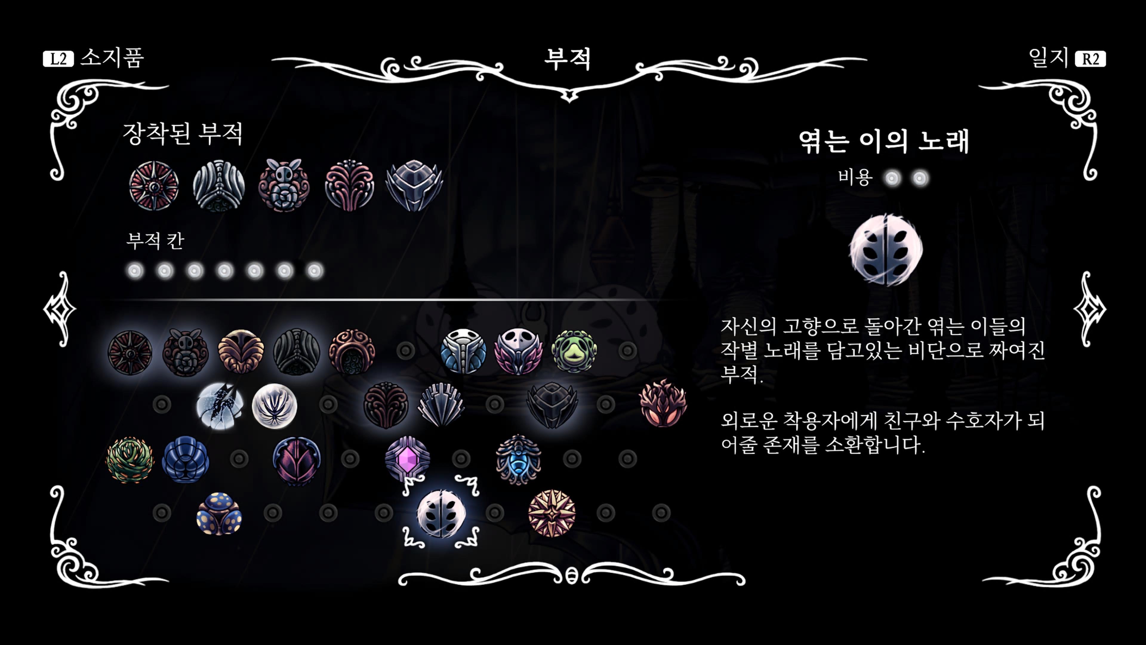필자는 긍지의 표식과 불멸의 힘 이거 두 개는 거의 필수로 달아놓고 게임을 해서 여유 부적슬롯은 항상 5칸이었다. 나머지는 그때그때 필요한 대로 바꾸며 플레이했다.